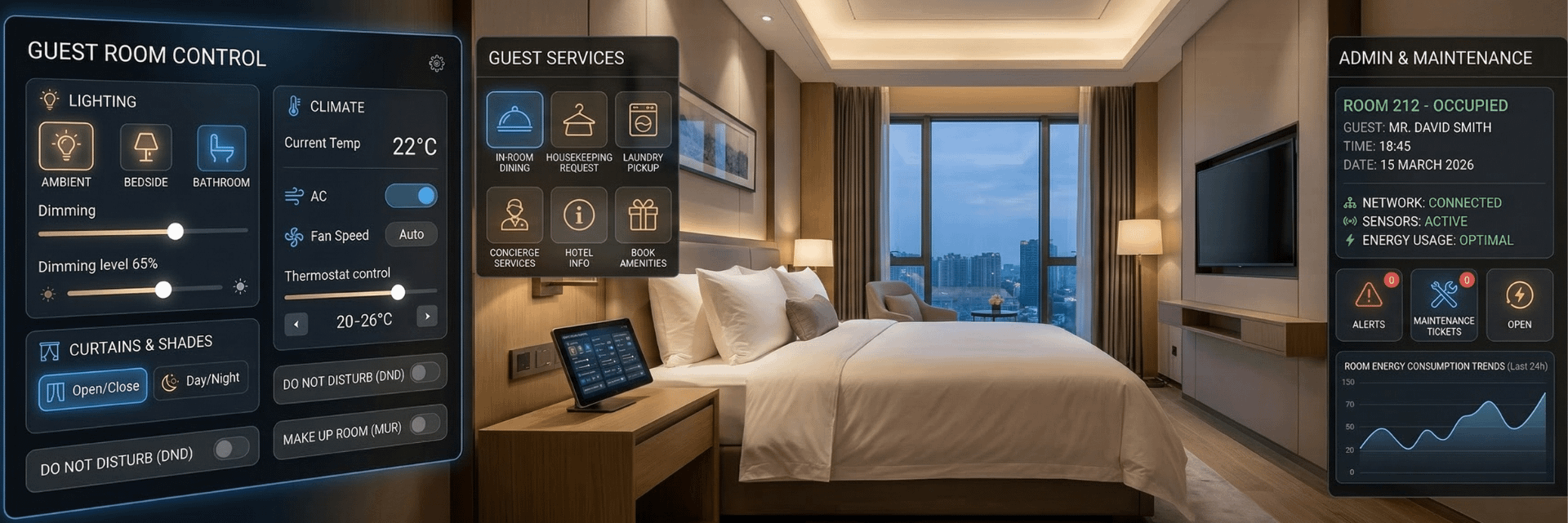 إدارة الطاقة: يعمل على تحسين استهلاك الطاقة من خلال التحكم الآلي في أنظمة الإضاءة والتكييف (HVAC) بناءً على حالة إشغال الغرفة وتفضيلات النزيل.